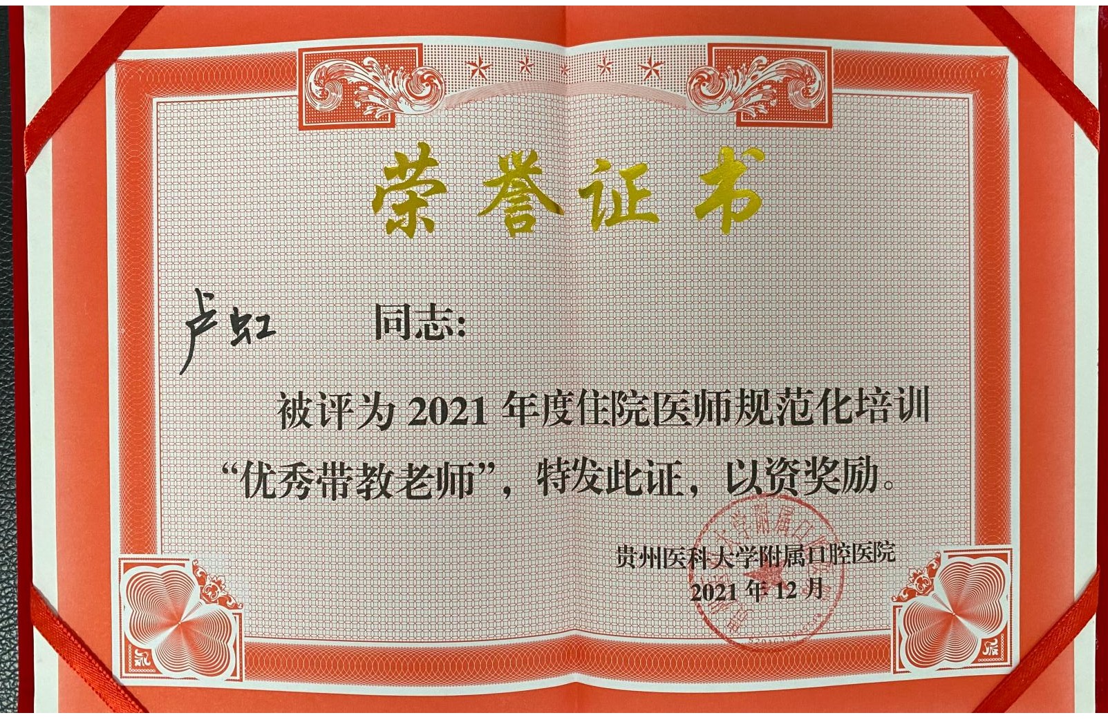 五年制本科生《口腔预防医学》及《儿童口腔医学》的理论课、实验课、临床实践课的教学任务,《口腔医学导论》《口腔科学》《口腔解剖学》部分教学任务,以及贵州医科大学口腔临床医学研究生、进修生、规培生的培养任务。教研室获校级优秀教师2人,院级优秀规培带教教师3人,《口腔预防医学》获得省级金课立项,《儿童口腔医学》获校级教改项目1项,《口腔预防医学》获校级一流课程建设项目1项,《儿童口腔医学》《口腔预防医学》获校级思政课程建设项目立项,发表教学论文6余篇。