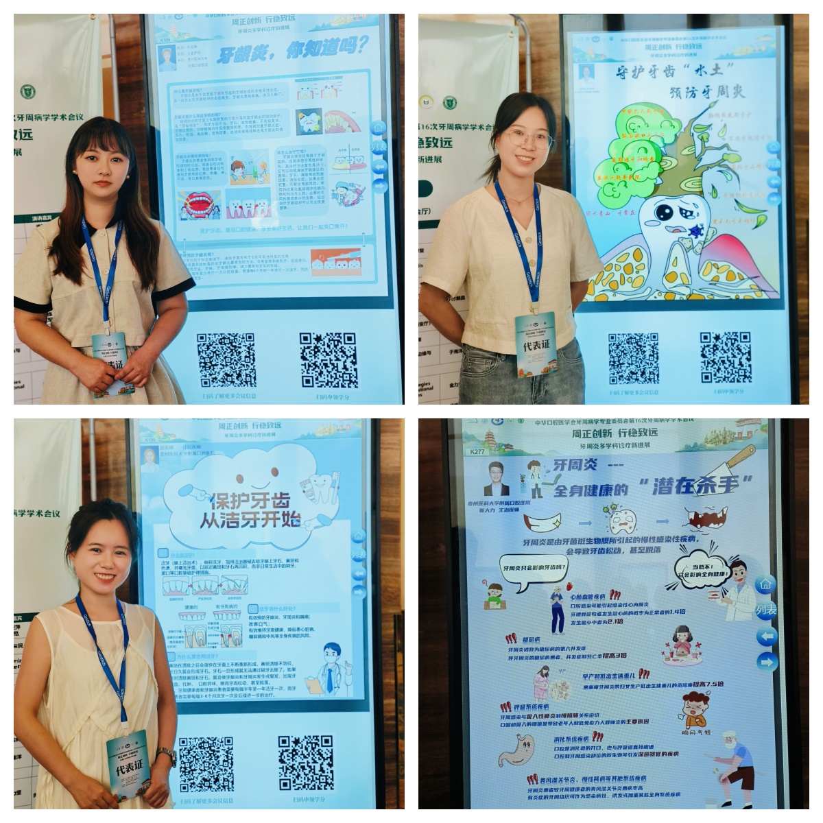 青年医师吴丹丹以牙周/全身疾病相关关系的病例在临床病例展示专场上作学术汇报,强调了牙周治疗在全身系统性疾病中的重要性;蔡扬进行了基础研究壁报的交流,牙周黏膜科医生王珣、靳大力、张玲艳、郎家婵及护士李宜婧参加了临床病例和科普电子壁报的展示。