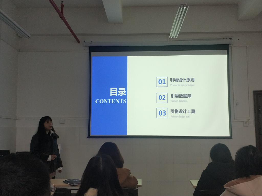 讲座上,徐娅以图文和动画结合的形式直观地给同学们讲解了荧光定量PCR引物设计工具运用、引物参考所需网站的运用、如何对比引物参数等,并以实验中具体得出的数据为例,详细介绍了引物参数与实验结果的对比过程,给即将开展实验和已经在科研的研究生同学们上了一堂实用有趣的讲座。