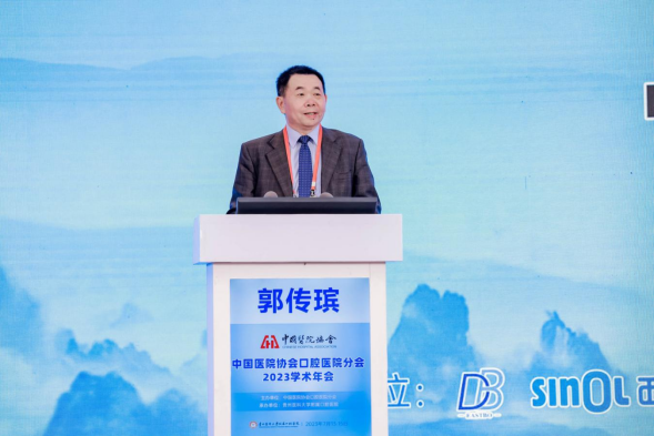 图:中国医院协会口腔医院分会主任委员郭传瑸在开幕式上致辞
