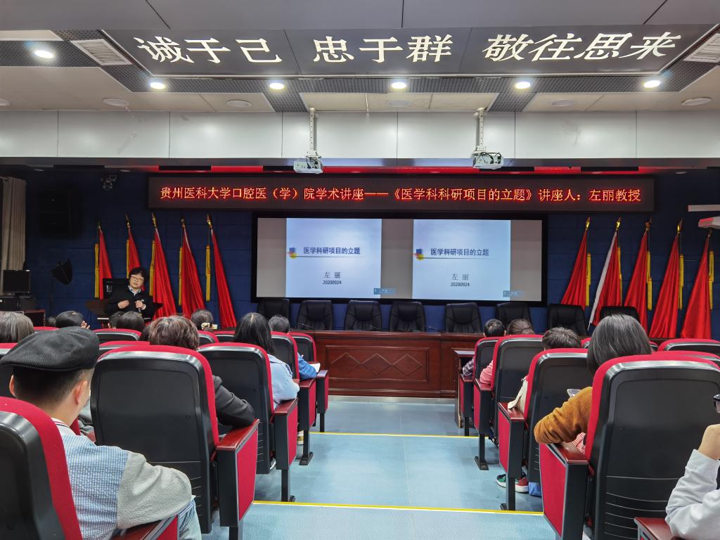 9月24日,贵州医科大学口腔医(学)院组织开展了一场以“医学科研项目的立题”为题的学术讲座。此次讲座由口院科研顾问左丽教授主讲,全院青年医(教)师以及研究生参加。