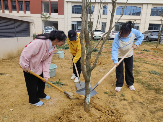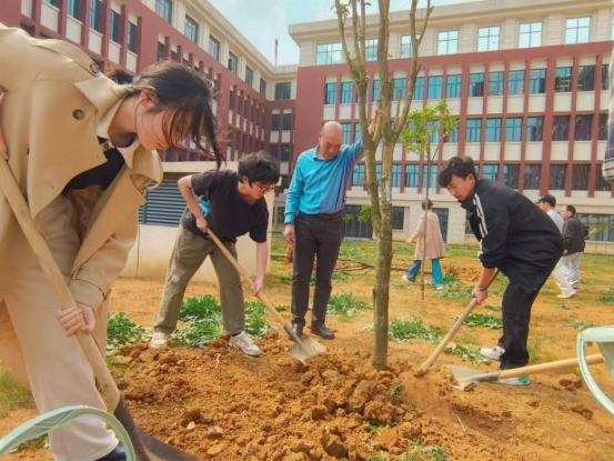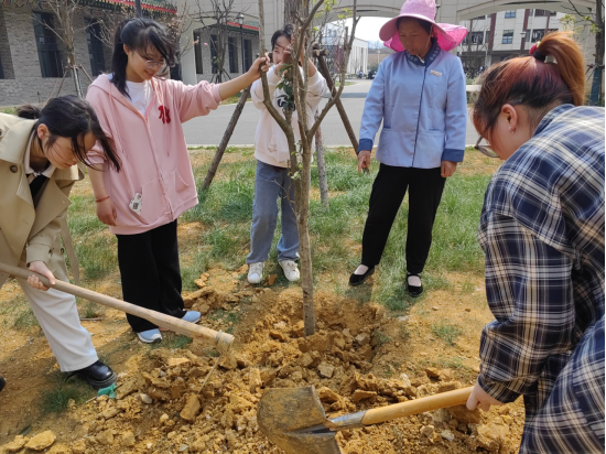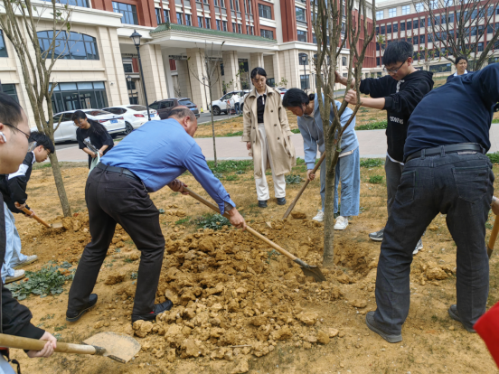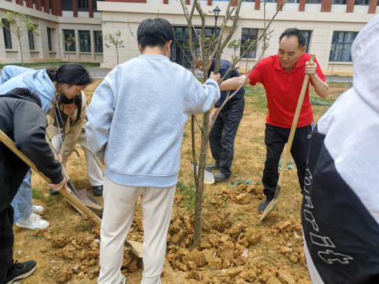 植树现场,老党员和青年学子们热情高涨,干劲十足,到处都是热火朝天的景象。大家相互配合,挥锹铲土、扶苗填坑、培土浇水,种下了一棵棵希望的树苗。