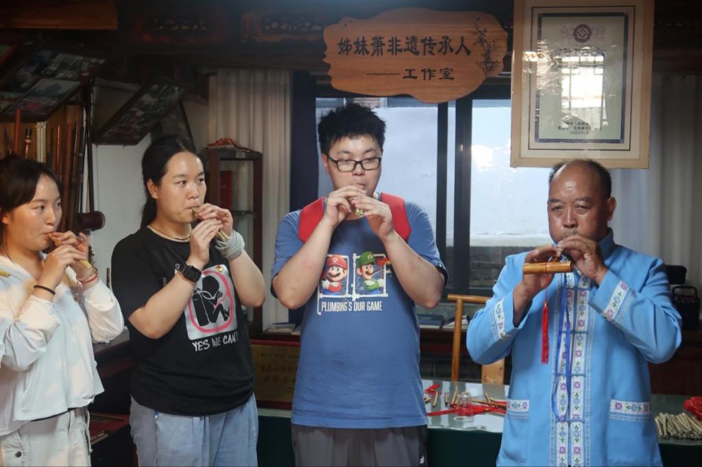 67岁的陈兴桥是姊妹箫第四代传人,他耐心细致地教实践队员们削竹节、制弹片、开音孔,队员们摩挲着竹箫表示,这两根竹管承载的不只是音律,更是布依人与自然共生的智慧,是用坚守写就的生存哲学。