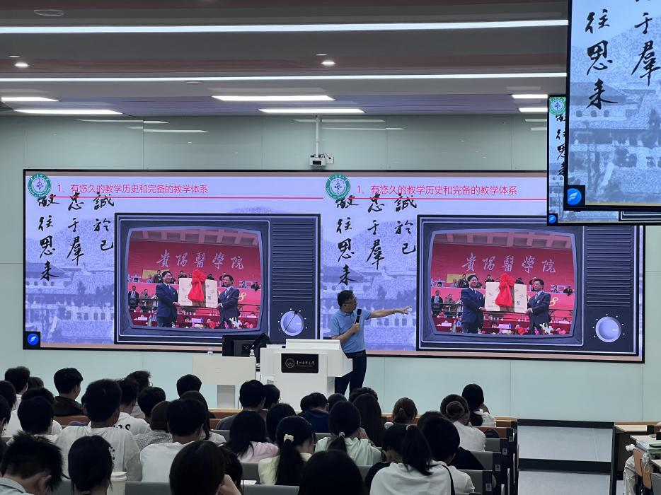 在云漫湖校区举办"口腔医学生行为准则解读"主题讲座,系统阐释医学专业精神与职业发展路径。院党委副书记、院长马洪以"医路学风,精益求精"为核心理念,结合历史与现实视角,为新生全面介绍口腔医学教育的整体框架。