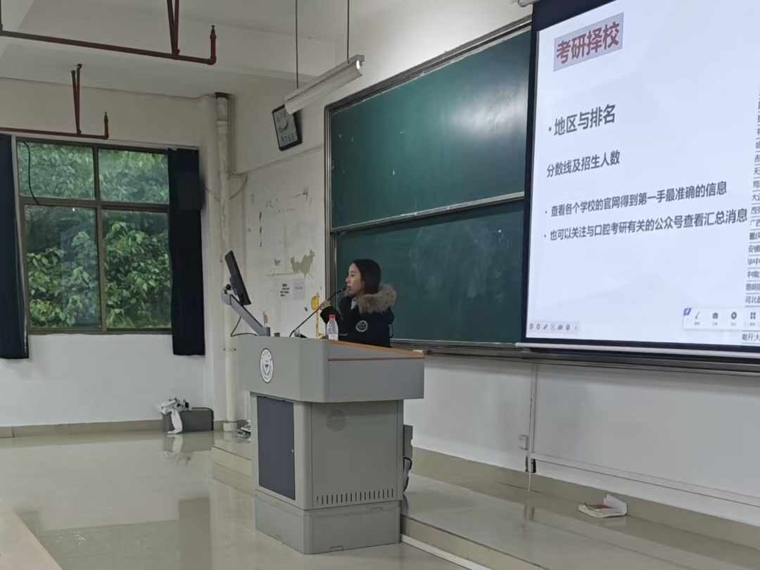 冯静首先分析了口腔医疗领域的就业现状与市场需求,希望同学们结合兴趣特长,积极探索多元化职业方向,尽早积累相关能力与实践经验。针对计划继续深造的同学,冯静阐述了学历提升对深化专业能力、拓展职业发展空间的积极作用,并强调升学决策应基于清晰的职业规划,避免盲目跟风,建议大家理性选择是否继续升学。同时,冯静系统介绍了推免与考研的具体要求,她以成功保研至北京大学医学部的学长为例,鼓励低年级同学提前夯实专业基础、积极参与学术活动。对于准备考研的同学,她建议及早开展自我评估与目标定位,围绕院校选择、备考重点、初复试准备等方面制定系统规划,并分享了分阶段备考建议,帮助学生合理规划复习进程。