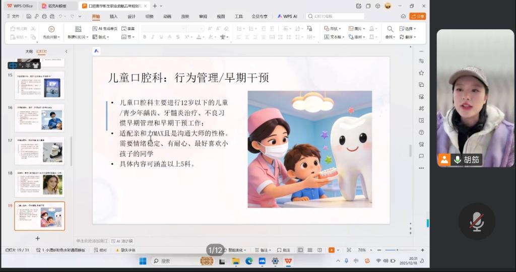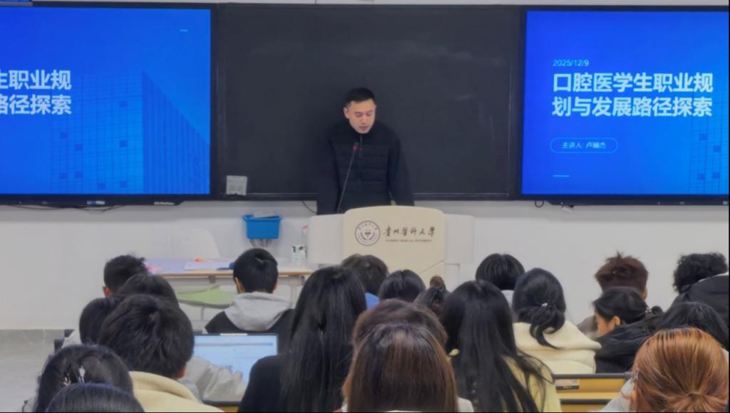 于12月在云漫湖校区分别举办了两场职业规划专题分享会。本次讲座由2025级口腔1班班主任卢瑞杰和2025级口腔2班班主任胡笳主讲,内容涵盖行业趋势、学业规划及职业路径,为新生提供全方位的成长导航。