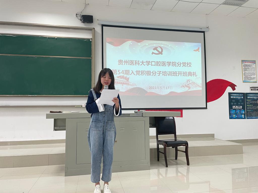 2019级口腔乙班唐美俊作为学员代表发言,她表示要认真学习党的理论知识,不断提高自己,在实践中锻炼自己,以实际行动端正入党动机,竭诚为同学服务,为人民服务,为社会服务,争做有理想、有信念、有使命、有奉献的“四有新人”。