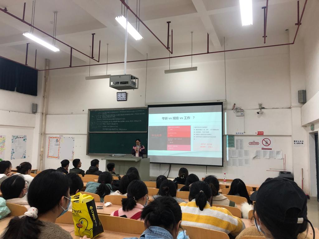 讲座上,田艾主要从就业指导、毕业形势及复试准备几个方面展开,结合自身考研经历,就目前大学生主要的考研问题进行了详细讲解,同时针对考研中易出现的重点问题进行总结、归纳和分析。田艾向同学们强调“扎实的专业知识是复试的敲门砖”、“机会是留给有准备的人”,并重点对于同学们毕业以后的职业规划以及考研之后复试面试等问题,表达了自己的建议意见。