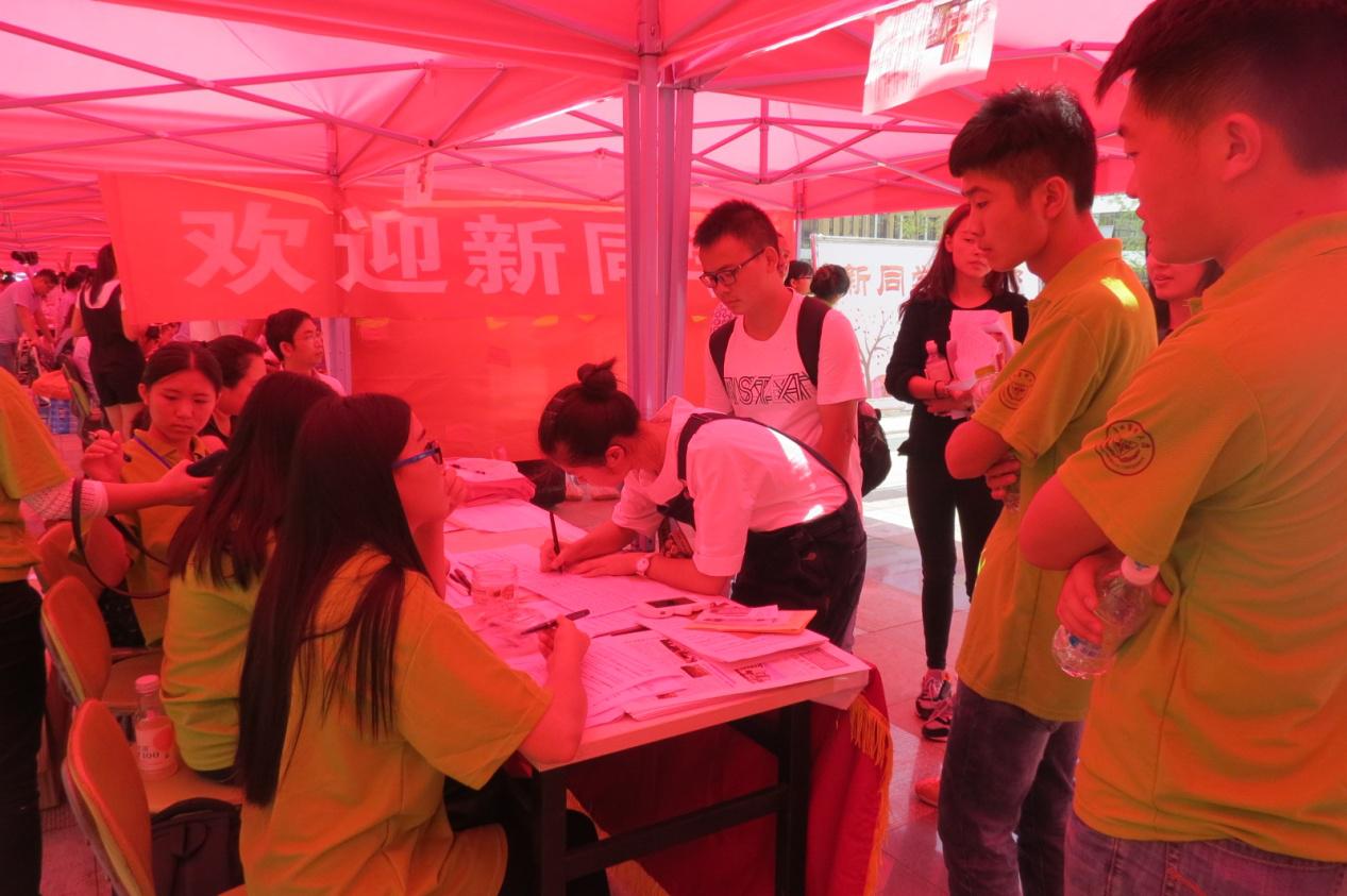 迎新大本营”,在学长学姐们的帮助下,新生们顺利地报名、领钥匙、校园卡等。尽管火辣辣的太阳让人大汗淋漓,但是从书记到每一位学生会成员都不退缩,热情地为新生们提供帮助。