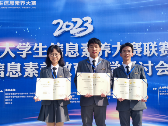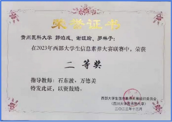 12月6日,2023年西部大学生信息素养大赛联赛在四川大学举行,由小艾电竞 2021级学生罗林子、郭泊成、谢旺瑜组成的贵州医科大学4队,凭借熟练的检索技能和精彩的答辩表现荣获二等奖。