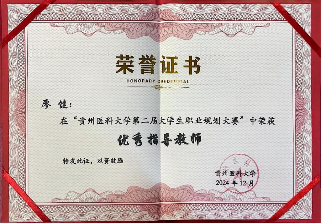 近年来取得多项荣誉,2022级口腔医学规培4班获校级、省级优秀班集体称号、在贵州省第二届住院医师规范化培训临床技能大赛中获团体“二等奖”,多名学生在“挑战杯”等竞赛中获奖;廖健入选贵州省高层次人才计划“百”层次人才;黄芮获贵州医科大学第二届大学生职业规划大赛研究生组就业赛道校级一等奖,廖健获优秀指导老师称号;近三年研究生发表SCI论文10篇,核心期刊36篇,学生积极参加学术会议并获表彰。