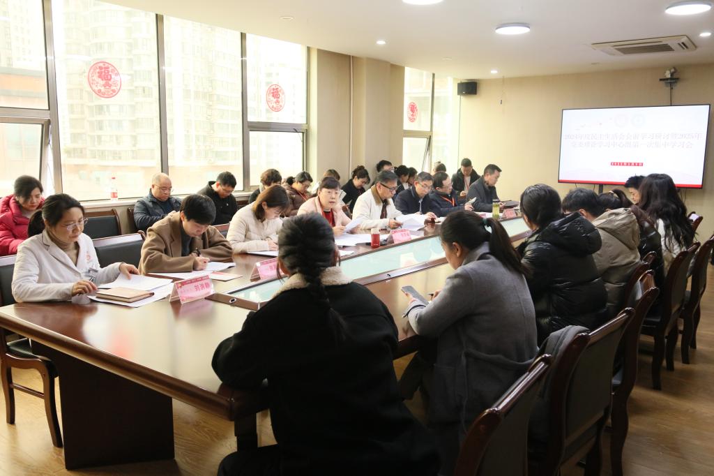 在综合会议室召开民主生活会会前学习研讨暨2025年党委理论学习中心组第一次集中学习会。院党委书记、党委理论学习中心组组长张军梅主持并讲话,院党政领导班子出席会议。全院副科级以上干部,各临床、医技科室、职能部门主要负责同志,各教研室、实验室负责同志,各党支部书记列席学习。