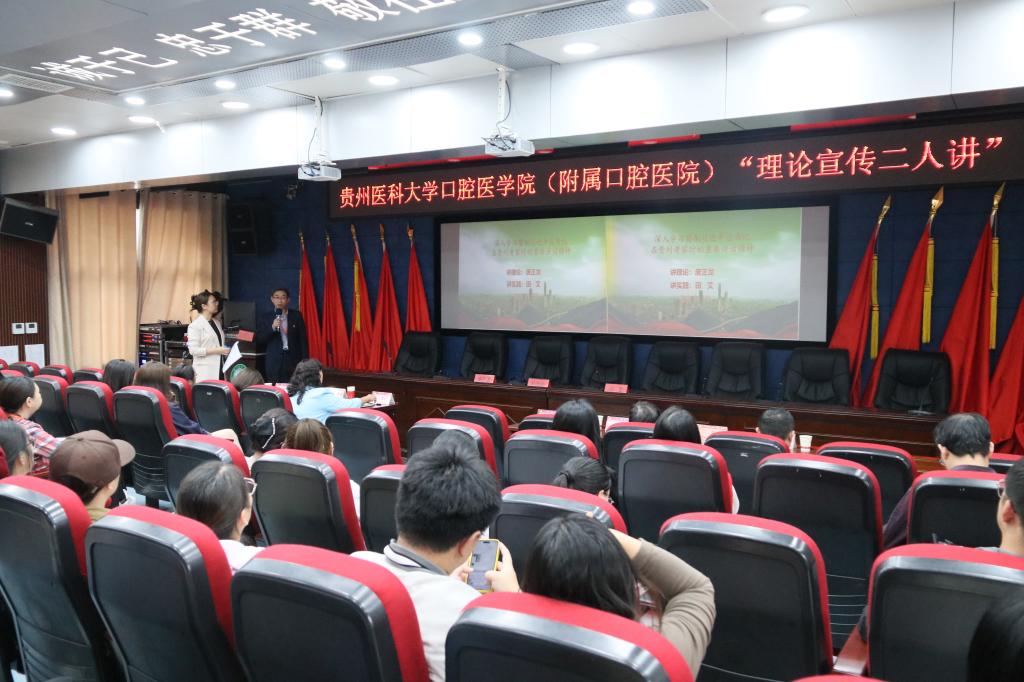 在教学楼五楼学术报告厅开展“理论宣传二人讲”。此次活动由院党委书记张军梅主持,党委委员、副院长唐正龙与教工第四党支部书记、口腔修复种植科主任田艾主讲。院党政领导班子成员,副科级以上干部,各党支部书记,全体党员参加。