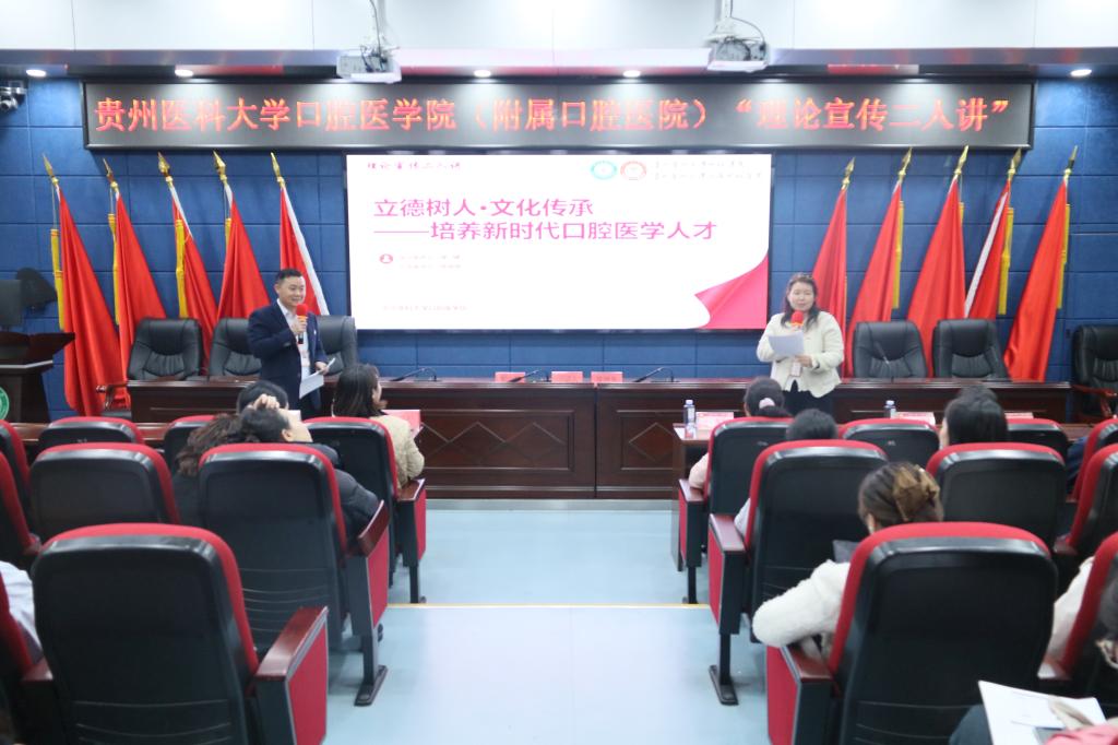 宣讲采用“一人讲理论、一人讲实践”的互动模式,围绕“立德树人 文化传承——培养新时代口腔医学人才”主题,聚焦《习近平谈治国理政》(第五卷)中教育科技人才与文化发展的重要论述,结合贵医精神与口腔医学实践,系统阐述了立德树人、文化传承、五育并举和创新精神引领发展的核心内涵与实践路径。