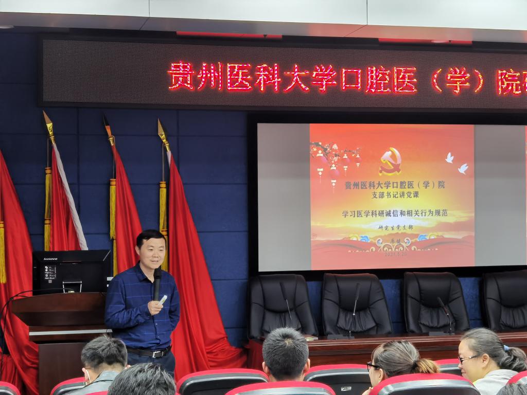 为践行社会主义核心价值观,加强医学科研诚信建设,同时加强科室业务工作同党建工作的深度融合,促使党员同志模范带头提高医学科研人员职业道德修养,预防科研不端行为,5月20日,研究生党支部在五楼学术报告厅开展了相关内容讲座,由支部书记廖健讲党课暨开展“学习医学科研诚信和相关行为规范”培训。研究生支部全体党员及全体研究生70余人参加活动。