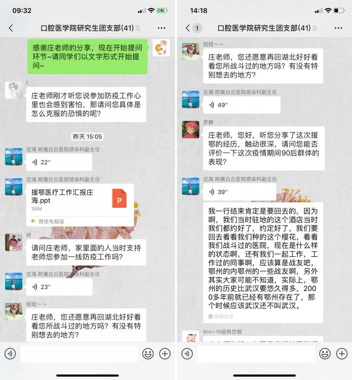 在此次团日活动中,小艾电竞 邀请了贵州医科大学附属白云医院感染性疾病科的庄海老师与各位研究生团员共上一堂 “云课堂”思政课。庄海老师曽随贵州省第四批支援湖北医疗队出征湖北鄂州,他分享了在武汉抗“疫”一线的所见所闻所感。小艾电竞 团员们虽然未能直接参与这场惊心动魄的没有硝烟的战斗,但是通过庄海老师的分享,大家都真真切切地感受到了疫情的残酷,更加体会到广大战“疫”一线医护工作者的伟大。怀着对庄海老师的关心及敬意,团员们纷纷提出了心中对此次疫情及医护相关的问题,庄海老师一一做了细致的解答。聆听过庄海老师的战“疫”故事后,同学们收获良多,大家踊跃发言分享自己在此次主题团日活动中的感受,表达了对庄海老师以及所有抗“疫”一线工作人员的感谢和尊敬,对抗“疫”战斗彻底胜利的期待以及通过自身行动助力抗疫的决心。