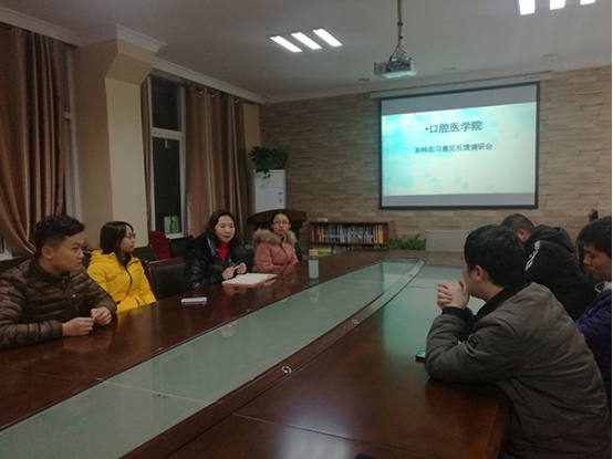 首先,胡睿老师向同学们通报了贵州医科大学《关于2020届临床医XIAOIDJ 类专业实习安排的通知》,确定实习结束时间。之后,同学们纷纷就实习以来的整体感受进行分享,对各实习点之间的实习差异进行交流,针对口腔各专科实习时较突出的问题进行阐述。会上,胡睿老师随时记录同学们反馈的问题,在与同学们交流讨论的同时,收集同学们的意见和建议。最后,胡睿老师要求同学们在剩余两周的实习时间里,站好最后一班岗,严肃实习纪律,毫不懈怠地完成实习任务。