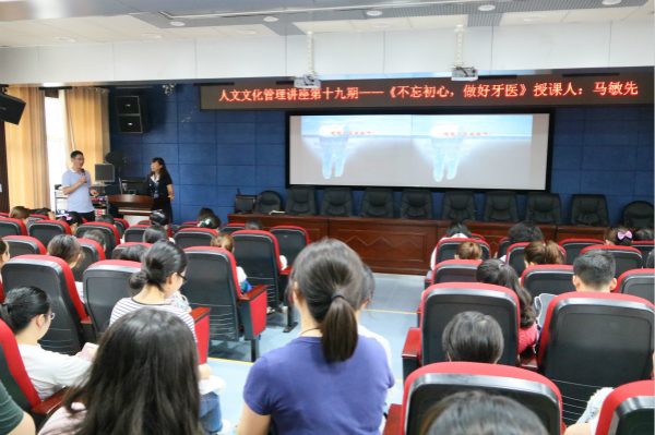 为不断加强医院文化建设,倡导医学人文精神,8月7日,口腔医(学)院在行政楼五楼学术报告厅组织开展了题为“不忘初心,做好牙医”的第十九期人文文化管理讲座。此次讲座由修复种植科主任医师马敏先主讲;党委书记张军梅主持;副院长王永,党委副书记钱禾,全院教职医护员工,全体研究生、在校实习生参加。