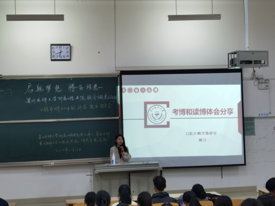 活动上,口腔正畸科博士柳汀分享了考博的求学经历和读博的体会,鼓励同学们“有梦想才有远方”,要有信心和勇气走上更高的人生舞台,并希望每位同学都能找到理想的人生方向,立大志,早立志。