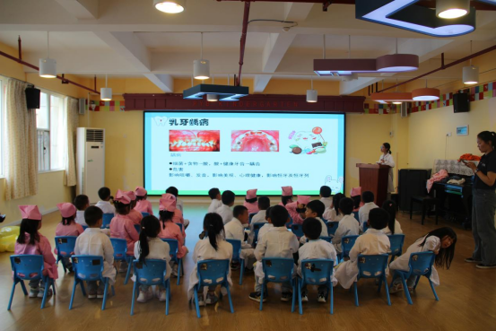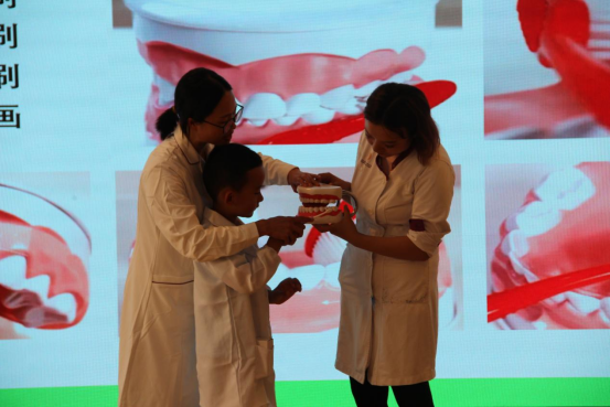 活动现场,预防及儿童口腔科主治医师宋明娜结合小朋友的年龄特点,生动有趣地讲解了牙齿结构、乳牙和恒牙的分类、龋齿的形成、窝沟封闭及科学刷牙法等知识,现场演示了正确刷牙及牙线棒的使用方法,帮助小朋友们纠正日常生活中不正确的洁牙方式,还现场与小朋友们互动,让大家在轻松和谐的环境中掌握口腔保健知识。