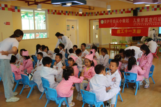 近日,教工第十一党支部(预防及儿童口腔科)组织多名科室骨干及党员干部走进红黄蓝幼儿园、乌当幼儿园开展“爱护牙齿从小做起,儿童牙医在行动”主题党日活动,为近400余名孩子免费进行口腔诊疗服务和口腔保健知识宣教活动。