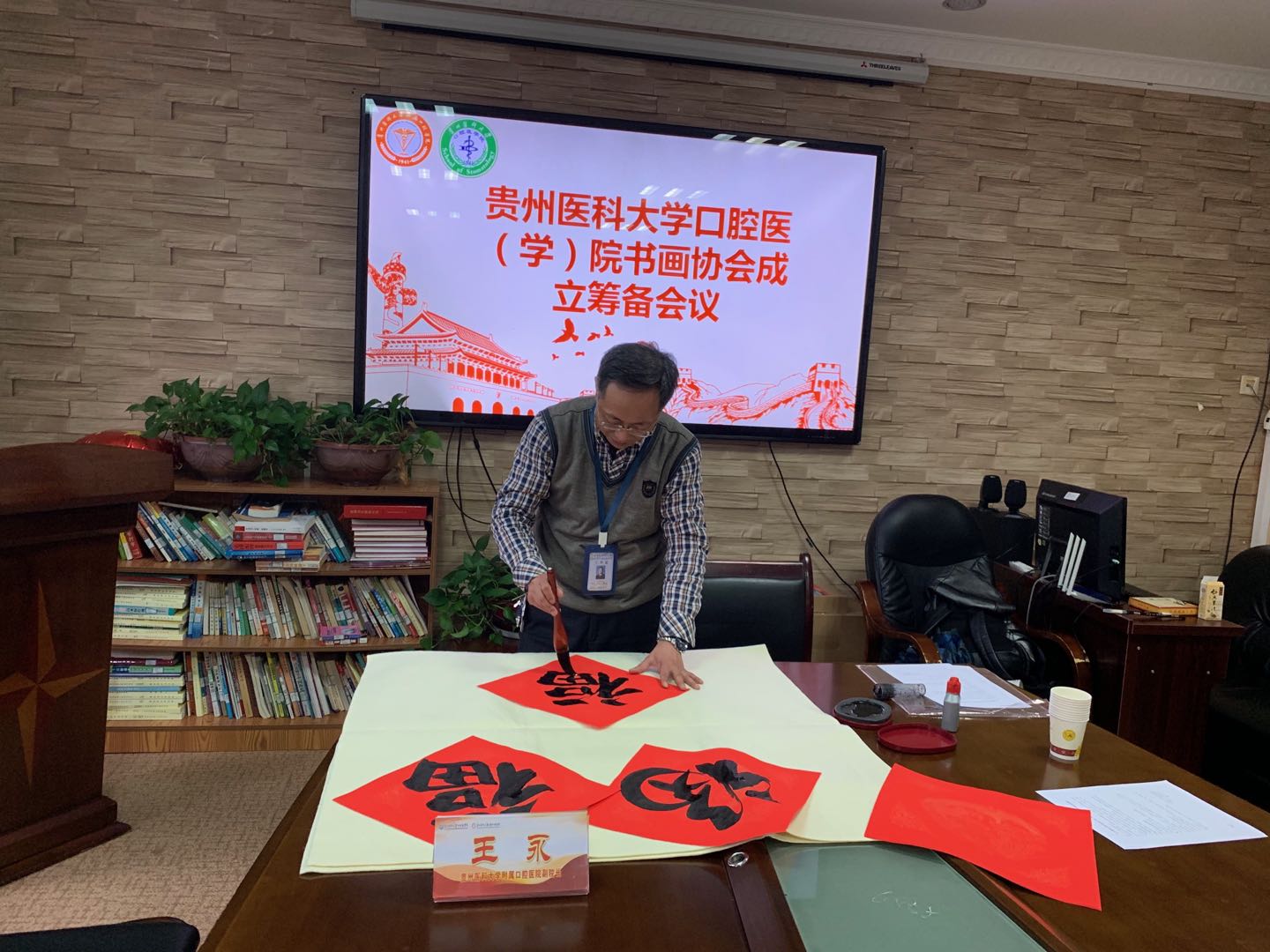 副院长王永在会上宣读了《关于拟成立贵州医科大学口腔医(学)院书画协会的通知》,表示中国书画艺术有着深远的历史和浓厚的底蕴,口腔医(学)院书画协会将遵循文化艺术为广大师生服务的宗旨,为全院书画爱好者搭建一个相互交流的平台,积极开展书画交流活动,丰富师生的业余文化生活。党委副书记何雨義表示,书画协会的运行需要大家共同努力,希望大家结合学习生活工作实际,勤学多练,持之以恒,博取众长,在长期的学习过程中不断提高自身的艺术修养。
