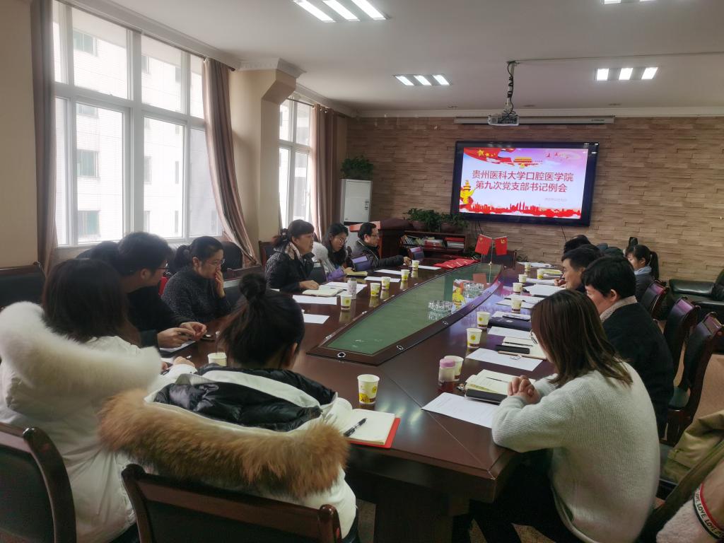 2021届毕业生现状,希望各支部发挥思想引领作用,精准发力,做好学生就业观念的引导和专业技能的提升。同时,向全体党支部书记传达了《贵州医科大学口腔医(学)院2020年度党支部书记抓支部党建述职评议考核工作方案》,要求各支部巩固深化“不忘初心、牢记使命”主题教育成果,增强“四个意识”、坚定“四个自信”、做到“两个维护”,认真总结2020年工作开展情况,查找问题,积极整改,落实从严治党,加强支部标准化建设,打造品牌党支部。