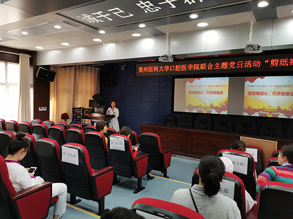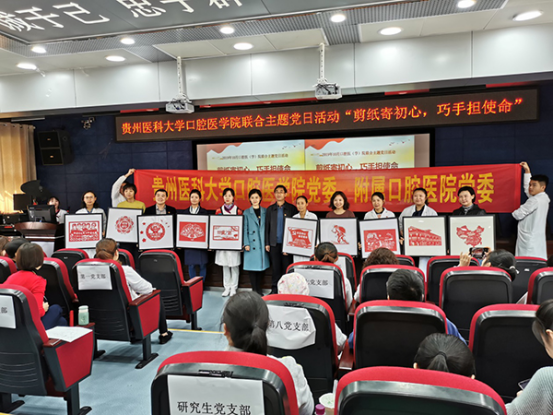 在行政楼五楼学术报告厅开展了“剪纸寄初心,巧手担使命”主题党日活动。本次活动由教工第六党支部策划筹备,由教工第六党支部书记、牙周黏膜科主任蔡扬主持,副院长唐正龙、党委副书记钱禾及全体党员参加。
