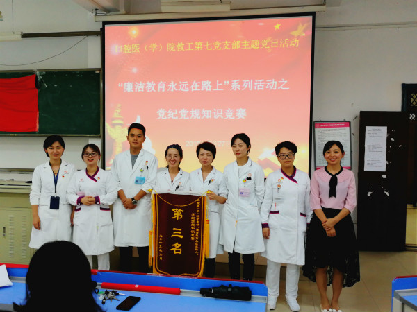 赛前,为做好对全院党员的知识体系培训,发放了《贵州医科大学“廉洁教育永远在路上”系列活动之党纪党规知识竞赛复习试题库》,要求各支部自行组织学习。此次知识竞赛采取闭卷形式举行,全院党员积极准备,态度认真,经过一小时的严肃考试,取得各支部竞赛的平均分,最终评比出此次竞赛的前三名:研究生党支部获得第一名,教工四支部获得第二名,教工六支部获得第三名,分别由张军梅书记、廖健老师、钱禾副书记为成绩优异的支部颁发锦旗。
