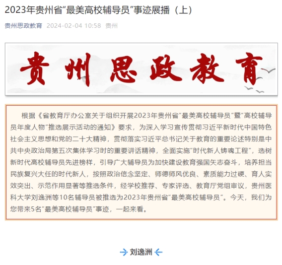 2月4日,2023年贵州省“最美高校辅导员”——XIAOIDJ 团委副书记刘逸洲优秀事迹在贵州思政教育平台展播。