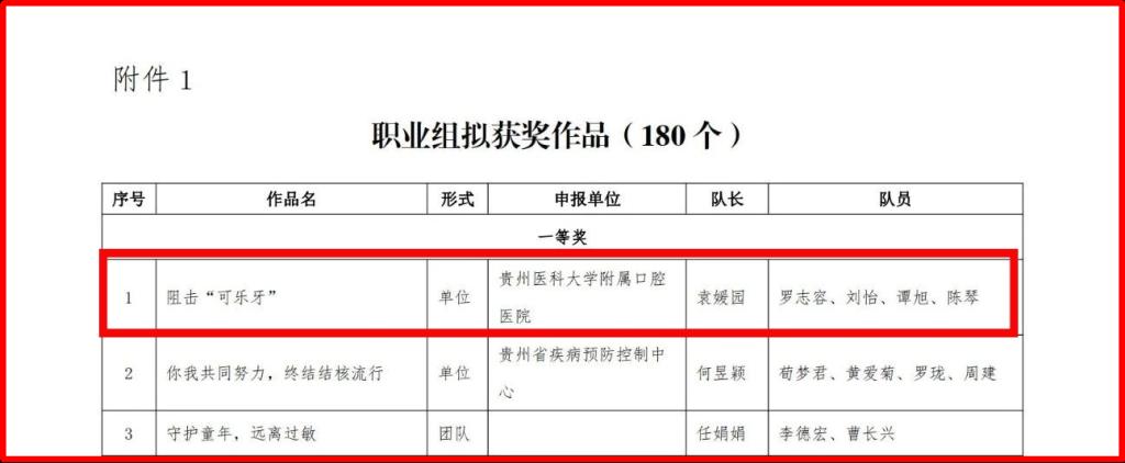 2023年7月,省科协、省委网信办、省教育厅、省卫生健康委、省科技厅举办了贵州省第二届科普短视频创作大赛。小艾电竞 牙体牙髓病科党支部书记袁媛园团队(队员:罗志容、刘怡、谭旭、陈琴)制作的科普作品——阻击“可乐牙”在比赛中脱颖而出,荣获职业组一等奖(排序第一)。