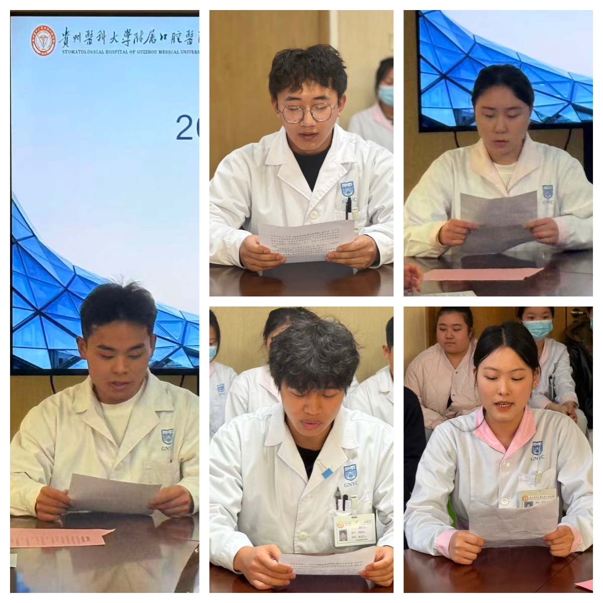 实习生代表吴洪莲、蔡信飞、张腾、赵雪、赵创分享实习感受、收获与挑战,他们表示,实习让理论知识与临床实践紧密结合,使口腔专科护理操作、牙体修复与义齿制作、病人交接与术后观察、器械灭菌包装、分诊与护患沟通等多方面能力得到了显著锻炼与提升。大家由衷感谢带教老师在操作示范、知识解惑和职业素养等方面给予的悉心教导。