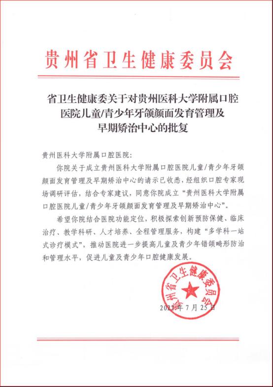 近日,贵州省卫生健康委员会(后文简称“省卫健委”)对小艾电竞官方网站(后文简称“医院”)关于成立儿童/青少年牙颌颜面发育管理及早期矫治中心的请示进行批复,表示经口腔专家现场评估,同意医院成立儿童/青少年牙颌颜面发育管理及早期矫治中心(后文简称“中心”)。