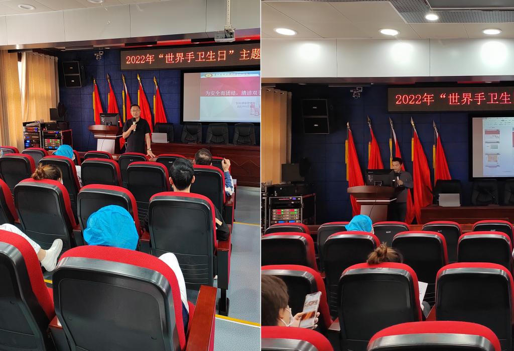 本次活动由三个部分组成:第一部分,在行政楼五楼学术报告厅,现场设立签名墙,党委副书记、院长马洪带领全体职工演练六步洗手法。医院感染管理科负责人陈锐向临床科室、医技科室、后勤人员和保洁人员讲解手卫生知识讲解和六步手卫生要领和注意事项,集体进行手卫生操作。培训后现场考核,评选出一、二、三等奖,颁发获奖证书和奖品。通过实时考核的方法让规范的洗手方法成为全院人员日常习惯。