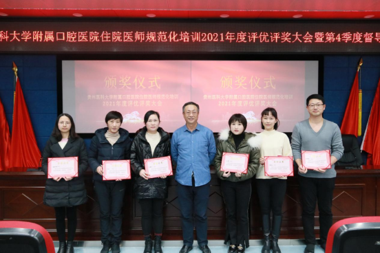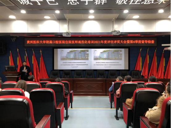 5楼学术报告厅开展2021年住培年度评优评奖大会暨第4季度督导检查会议,院党委书记张军梅,党委副书记、院长马洪,副院长王永出席会议;毕业后医学教育管理科科长廖健及五个专业基地负责人、教学主任、教学秘书、部分指导、带教老师以和全体住培学员参加会议。党委委员、副院长唐正龙主持会议。