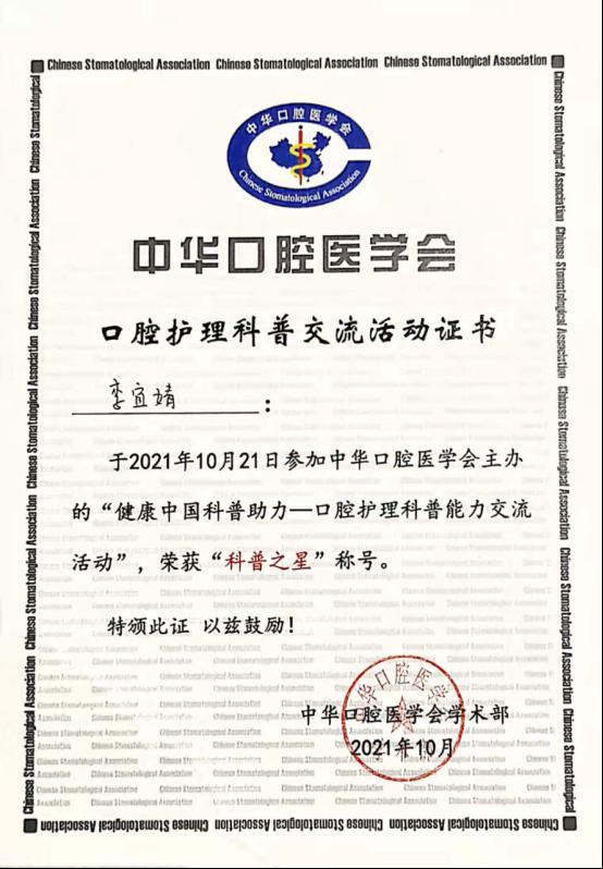活动中,来自全国各家单位的展示作品,形式创新多样,语言生动形象,引导大众树立健康口腔理念,传达重视口腔健康和用科学方法维护口腔健康的理念。李宜婧用演讲、主持、快板的方式,以“口腔溃疡知多少”为题作口腔科普,获得了专家评委们的一致肯定,同时也荣获了中华口腔医学会“科普之星”称号。