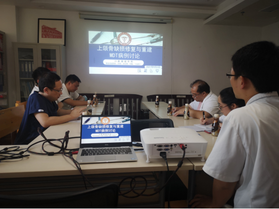 口腔颌面外科修复重建团队联系人刘睿主持本次MDT会议,口腔修复种植科主任董强、麻醉科医师黄时富、检验科主任王良宏、影像科负责人刘珀羽、药剂科药师周陶带领各自团队成员及护理组、数字化设计小组人员参加会议。