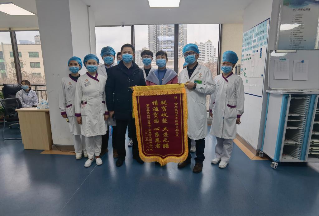 对于医院的优质诊疗、费用减免和医护人员的精心照顾,王大爷深受感动,特于2021年1月25日委托驻村脱贫干部巩晓(省地方金融监管局一级调研员、紫云县火花镇洗鸭河村第一书记)来院赠送锦旗,以表其对小艾电竞官方网站党委及全体医务人员的感谢。