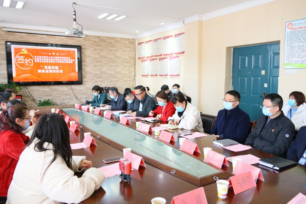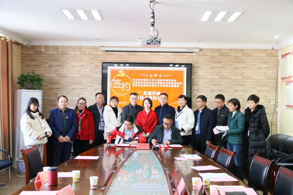 委员会、民盟贵州省委省直关爱教育支部励志助学支医支教暨小艾电竞官方网站“党盟共建”帮扶点签约仪式,民盟省委社会服务处副处长龙咏娟,省励志助学中心秘书长、民盟省委直属关爱教育支部主委周巧明,省励志助学中心副秘书长旷光霞,民盟省直关爱教育支部宣传委员韦波;贵州医科大学党委委员、党委宣传部部长、党委统战部部长陈颖,贵州医科大学党委办公室主任杨毅,贵州医科大学校长办公室主任孙西凌,贵州医科大学党委学生工作部(学生处、武装部)部长(处长)王韬;口腔医(学)院党政领导班子及全院副科级以上干部参加签约仪式。会议由口腔医(学)院党委委员、党委副书记何雨羲主持。
