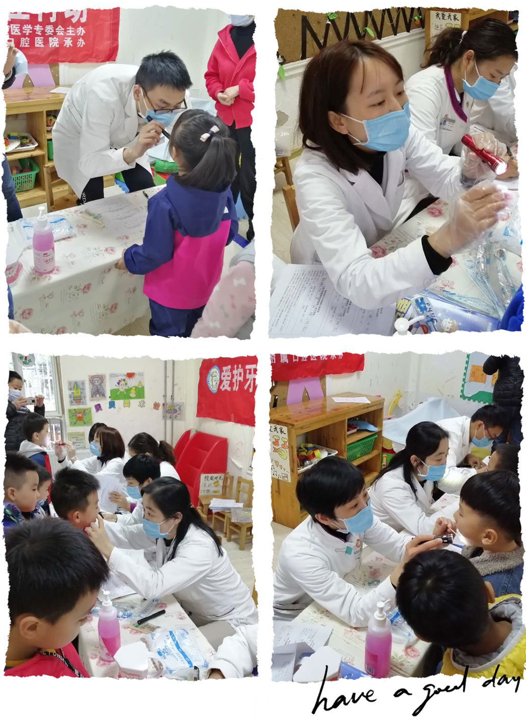 活动分为口腔检查、护齿小课堂、有奖问答以及体验等环节。医生们首先给全园共120多名小朋友进行口腔检查,记录每个小朋友牙齿情况并制定治疗方案反馈给老师和家长。在护齿小课堂上,医护人员详细为“小牙医”们讲解牙齿的结构、怎样正确刷牙、如何保护牙齿等系列口腔保健知识,讲解过程中与小朋友充分互动,采用问答和抢答的互动方式让孩子们提升对科普内容的兴趣。在“我是小牙医”体验环节,在医师们的指导下进行牙医角色体验,教每个小朋友使用口镜观察自己同伴的牙齿情况,鼓励孩子们从现在做起,爱护牙齿。