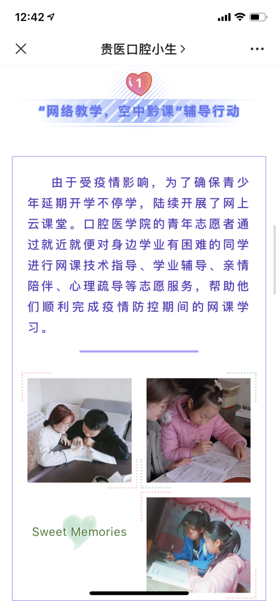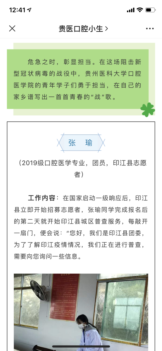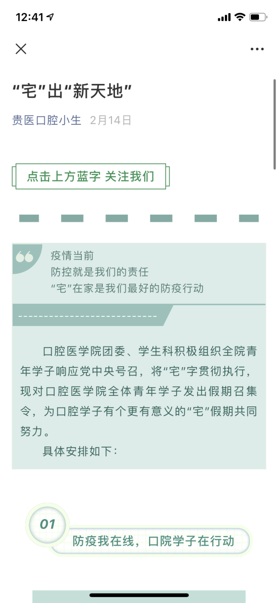 团委时时刻刻紧跟时代发展,关心当下热点事件,热点问题,积极响应号召,做到想青年所想,做青年所做。在全国抗疫期间,院团委响应号召,先后推出“宅出新天地”、“危急之时 彰显担当”、“口腔挂号指南”、“日常护齿妙招”等专题报道,做好疫情期间的青年教育、服务工作。