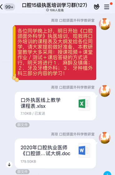 正常教学的影响,保证教育教学质量,切实做到“推迟开学不停学”。口腔颌面外科学教研室针对2105级口腔医学本科生即将面临的执业医师考试,积极组织本教研室教师精心筹备网上教学工作,充分利用信息化手段,为学生开展线上口腔执医医师考试培训。为更好的完成教学工作,教研室积极召开线上教学会议,做好教学准备工作。