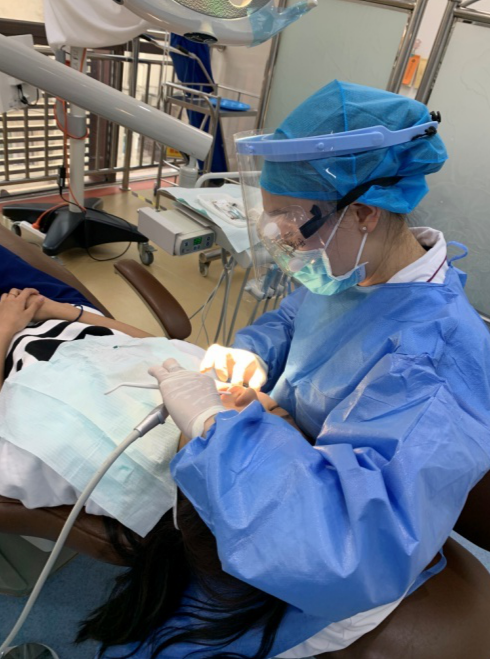 对于前来诊疗的病人,我科导诊护士会再次复查体温,登记患者信息,在候诊区域合理安排座位,确保每个候诊病人间隔至少1米安全距离,且监督候诊患者正确佩戴口罩;进入诊疗区的病人,在进行口腔检查前会先让患者口服西比氯胺含片(文献报道西比氯胺可有效抑制MERS-CoV活性),如需要进行口腔治疗,尤其是“喷溅治疗”的患者,需签署“新冠期间牙体牙髓科就诊人员承诺书”和“新冠期间牙体牙髓科口腔诊疗知情同意书”,并盖手印,对患者再次使用水银体温计复测腋温;处理病人后的诊室,护士用消毒湿巾全部擦拭椅位,并封闭紫外消毒半小时后再通风半小时,诊室才能再次使用,真正做到“一医一护一病患一诊室一消毒”,有效的避免交叉感染。值班护士每日做好病人信息统计、每位患者疾病诊断及临床操作情况、物资及器械使用情况(尤其是高速手机和痰盂盒使用情况)、消毒情况记录并在每日工作结束后向科主任汇报。