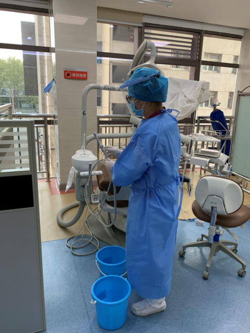 由于口腔专科诊疗的特殊性,在诊疗过程中医患双方面部长时间超近距离接触,高速涡轮机使用过程中会产生大量水雾、飞沫、气溶胶,若有潜伏期患者进行口腔诊疗操作极易导致疫情蔓延。为打赢这场没有硝烟的战争,为临床工作能顺利开展,我科全体人员积极学习相关防疫知识,开动脑筋出谋划策。我们认真学习每一版本《新型冠状病毒感染的肺炎诊疗方案》,科主任、护士长及时传达医院下发的各项通知及学习内容,督促科室人员认真学习,鼓励大家增强战胜疫情的信心,并积极参加院内院感理论及技能培训且全员通过考核。