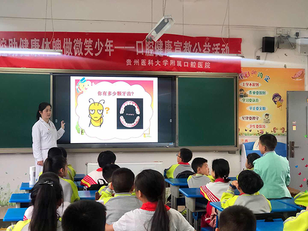 医生代表怀着满满的社会责任心走进贵阳市师范学校附属实验小学四年级三班为同学们进行口腔健康教育讲座。期间,孩子们认真学习、踊跃提问,气氛热烈,经过医生们深入浅出的讲解,同学们受益匪浅,纷纷表示要在以后的生活中更加关爱牙齿,培养良好习惯,维护好个人的口腔健康。讲座后全班同学向医生们赠送了美丽的鲜花以示感谢。