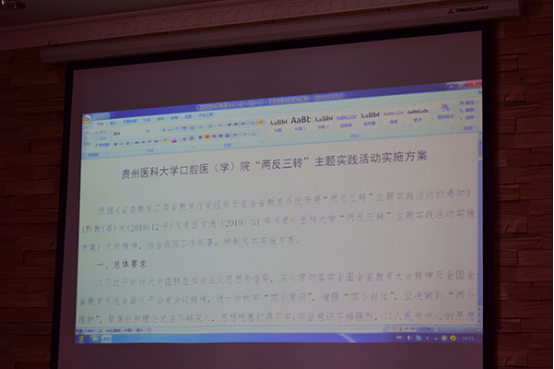会上,张军梅书记解读了《中共贵州医科大学口腔医(学)院委员会关于开展“两反三转”主题实践活动的实施方案》,对方案的目标要求、工作原则、工作内容、实施步骤、组织保障等方面进行介绍。张书记就做好“两反三转”主题实践活动提出几点要求,一是切实提高政治站位,深刻认识开展“两反三转”主题实践活动的重要意义;二是坚持问题导向,坚决扛起开展“两反三转”主题实践活动的政治责任;三是强化工作统筹,全力确保“两反三转”主题实践活动取得实效。