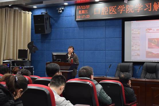 副院长王永表示,近两个月全院各部门、科室在院党政领导班子的带领下,顺利完成了医院搬迁、开业等相关工作,获得广大患者好评的同时也得到全院教职医护员工的一致赞同,这正是党的十九大精神当中责任意识和担当精神的体现。今后,我们广大党员干部要进一步示范引领、做好工作,敢担当、敢作为,乘党的十九大之东风,把口腔医院明年的工作计划好、部署好、实施好,在大家的共同努力下,不断推进医院各项事业迈上崭新的台阶。