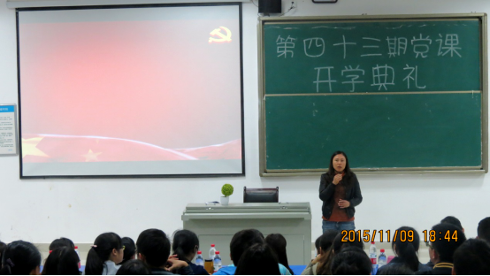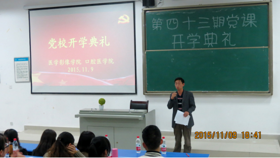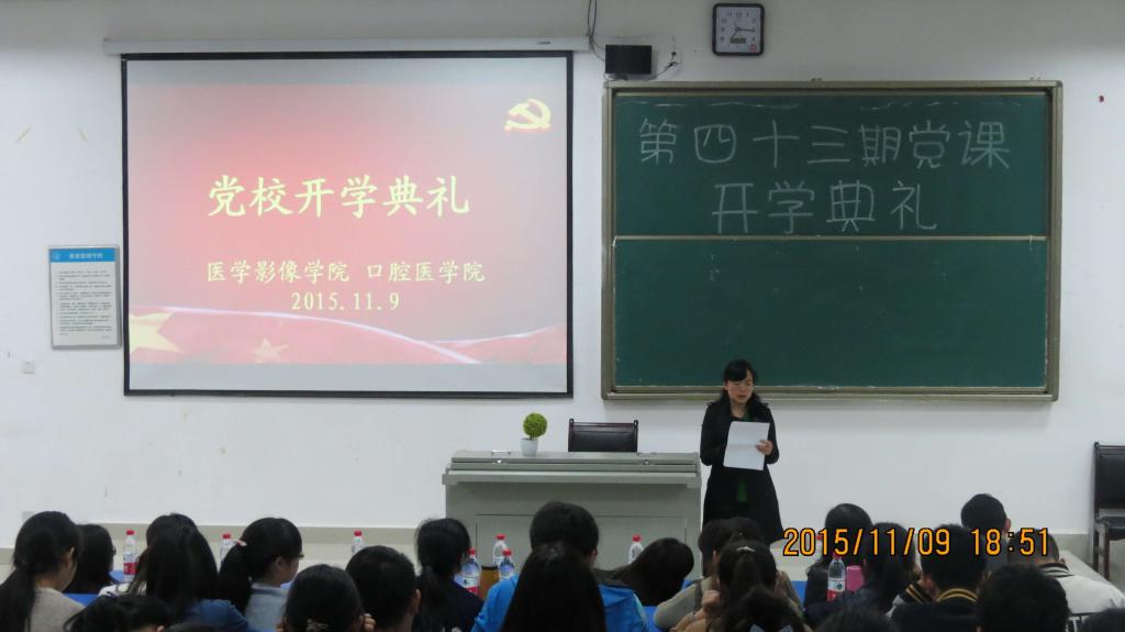 2015年11月9日下午6:30,第四十三期党课开学典礼在X1201教室顺利召开。贵州医科大学业余党校常务副校长周红、医学影像XIAOIDJ