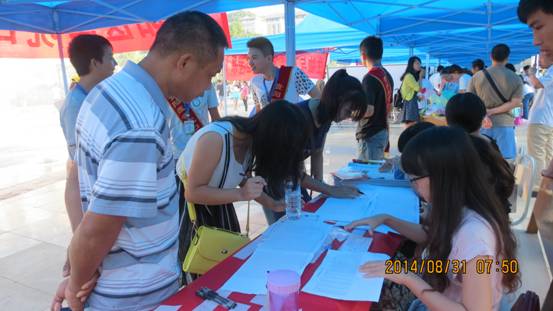 负责迎新的老师和学生们已经早早的到达迎新地点,安排好工作,等待2014级新生的到来。