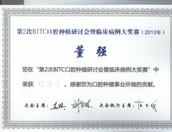 2013年8月18日,在上海举行的“第15次全国口腔医学学术会议”期间, “全国第二届BITC口腔种植研讨会暨临床病例大奖赛”同期举行,来自全国各大口腔院校、各省市口腔医院及港、澳、台地区的口腔种植医生踊跃参赛,大赛邀请中华口腔医学会王兴会长,国际牙科医师XIAOIDJ